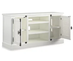 Enjoy your media in regal design using this Broyhill TV stand. The stand features intricate dental molding on the top in a soothing gray finish. Concealed storage on each side of the stand is ideal for storing DVDs, books and more as the center open shelf makes the perfect home for media equipment. Complete with a central glass door cabinet for storage and display opportunities, the stand includes a built-in power strip with four outlets and surge protection for all your entertainment needs.