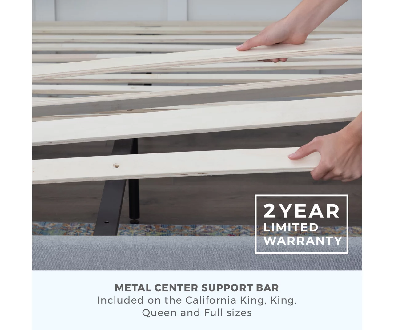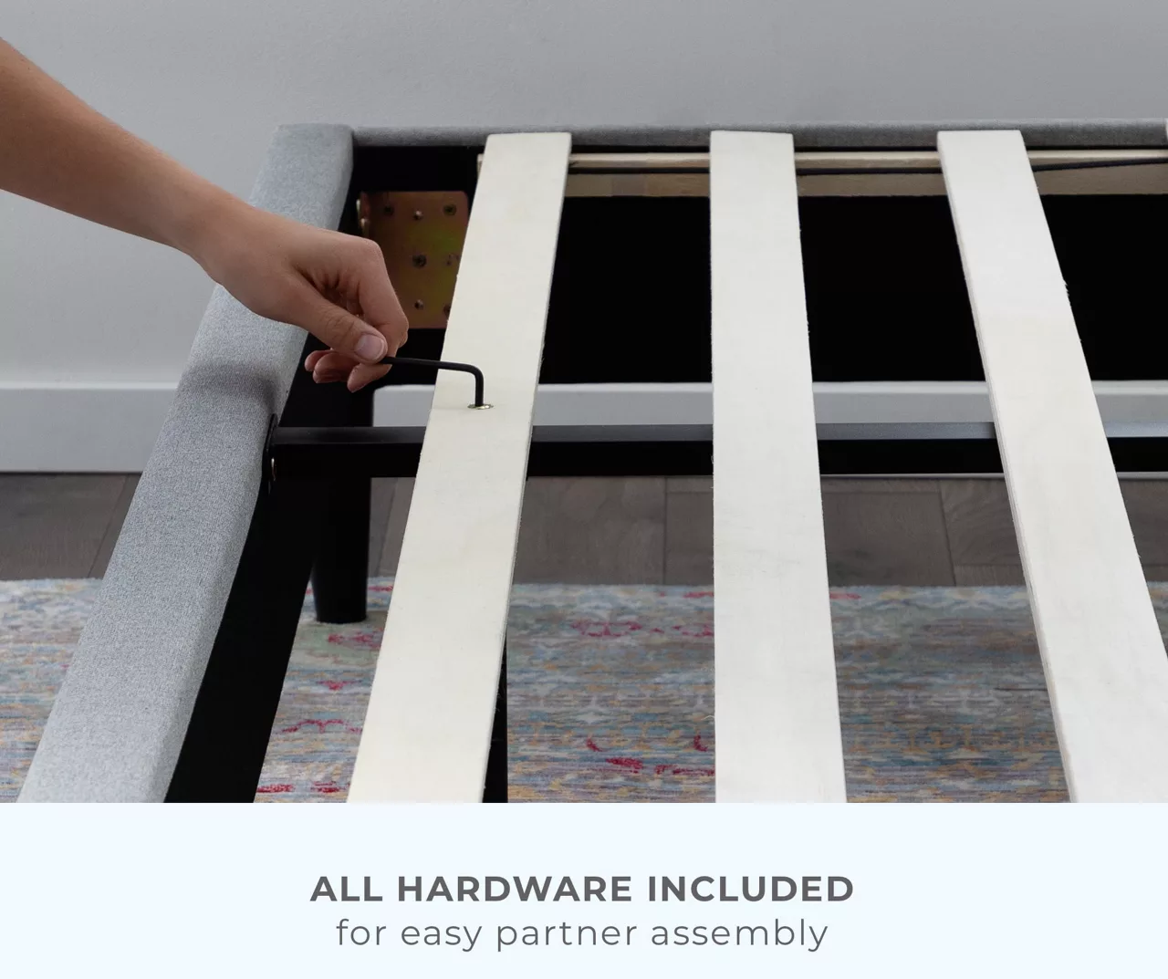 • Includes bed frame, headboard, side and foot rails, legs, 14-piece slat roll and all hardware needed for assembly